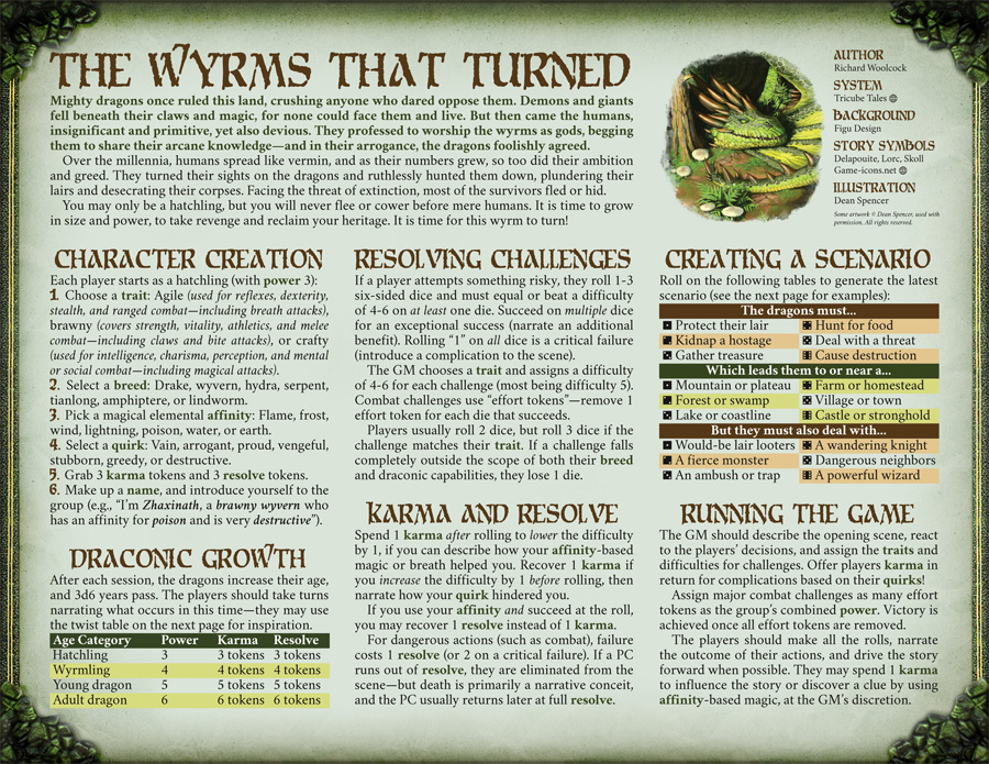 The Wyrms That Turned is a standalone scenario for the Tricube Tales system and is usable as a micro-setting, but it is also a fully self-contained one-page RPG in its own right. You can print it on a single sheet of paper: The first page includes everything you need to play, while an optional second page expands the adventure generator with examples and twists. The PDF uses layers for ease of printing.